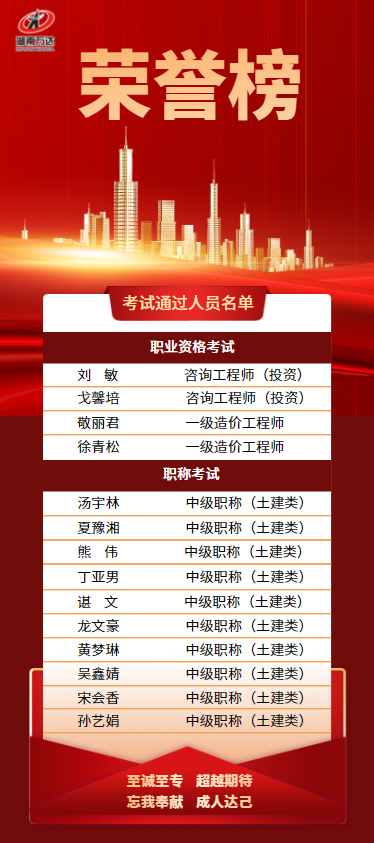 星光不問趕路人,功夫不負有心人。今后湖南萬達將持續(xù)引導和鼓勵員工積極參與注冊類職業(yè)資格考試和職稱考試,并通過人才梯隊建設和職業(yè)發(fā)展通道等方式,將優(yōu)秀人才納入到專業(yè)技術技能人才隊伍中,全面提升公司專業(yè)技術水平,增強公司核心競爭力,豐富公司人才儲備,為公司高質量發(fā)展提供有力的人才支撐。